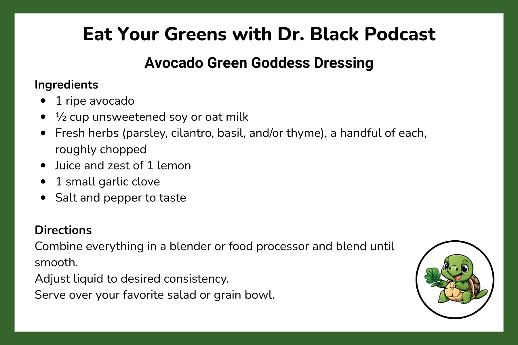 For resources related to a plant-based diet or if you struggle to afford healthy food for your family, please go to eatgreenswithdrblack.com/resources.